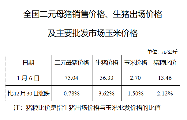 全国二元母猪销售价格、生猪出场价格及主要批发市场玉米价格(1月6日)