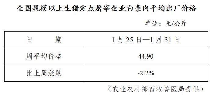 全国规模以上生猪定点屠宰企业白条肉平均出厂价格(1月25日—1月31日)