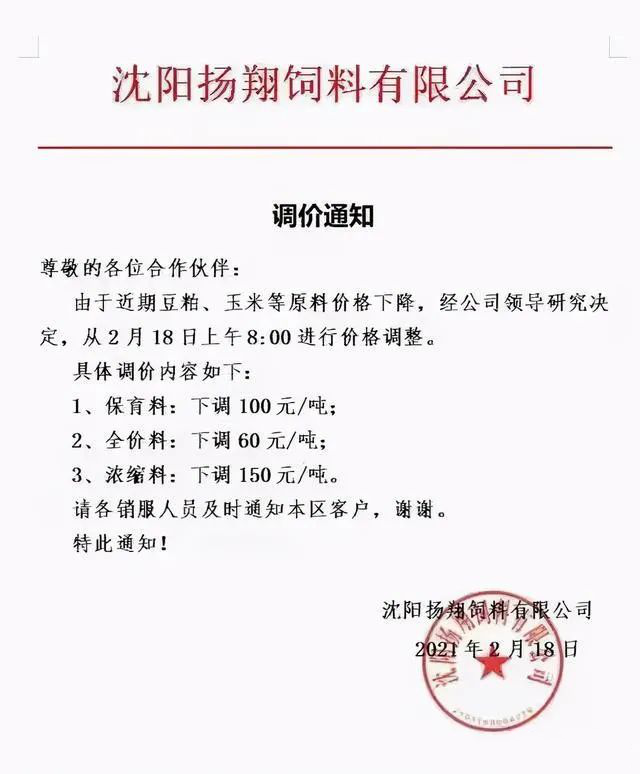 东北沈阳扬翔饲料厂已经通知:2月18日饲料价格下调60-150元/吨。预计近期各地也将出现饲料降价通知,掀起今年第一轮饲料降价潮。