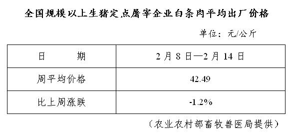 全国规模以上生猪定点屠宰企业白条肉平均出厂价格(2月8日—2月14日)