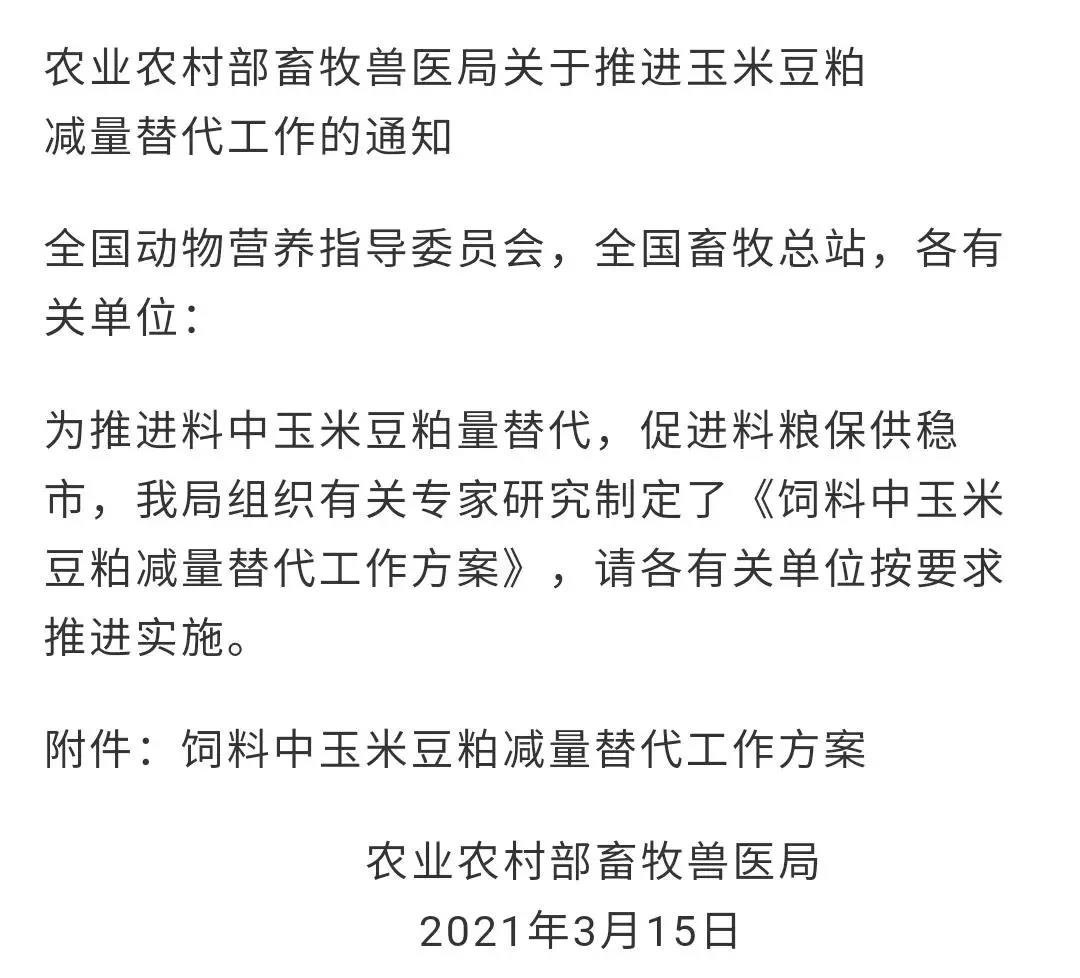 1、农业农村部畜牧兽医局发布《关于推进玉米豆粕减量替代工作的通知》