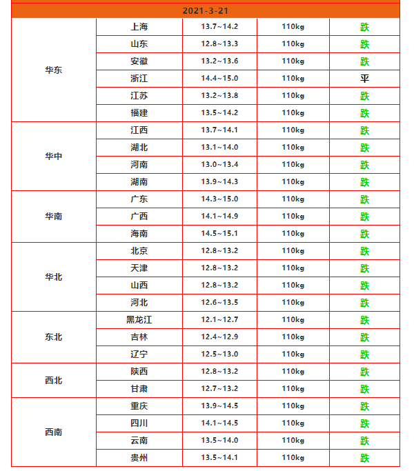 猪价系统显示,3月20日猪价继续下跌,全国除了浙江稳定在14.4-15元之外,其他地区全线下跌,其中北京、天津、山西最低价下探至12.8元,河北12.6元,黑龙江12.1元,吉林12.4元,辽宁12.5元,山西和甘肃分别是12.8和12.7元。北方各地基本都已经跌破13元了,甚至有地区距离跌破12元也仅一步之遥。均价方面,外三元均价为27.11元/公斤,也就是13.6元/斤;内三元均价为26.91元/公斤,也就是13.45元/斤;土杂猪均价为13.31元/斤。