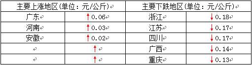今日全国27省、直辖市范围内,共计3省份猪价上涨,24省份猪价下跌。全国最高价为广东,较昨日上涨0.06元/公斤于29.44元/公斤;全国最低价为新疆,较昨日下跌0.06元/公斤于25.93元/公斤。