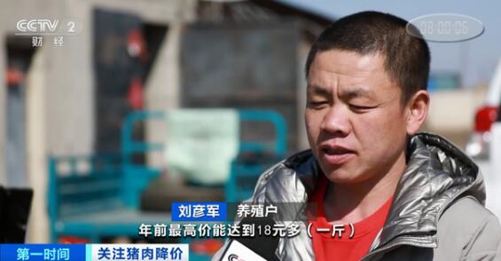 养殖户刘彦军:现在肥猪价格在12.5元至13.5元一斤,年前最高价能达到18块钱一斤,一斤掉了5块多钱。