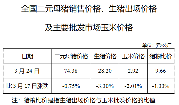 全国二元母猪销售价格、生猪出场价格及主要批发市场玉米价格(3月24日)