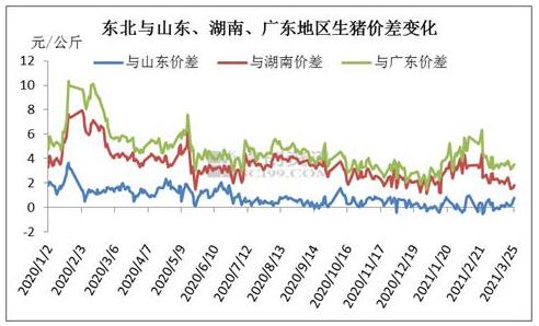 第三,南北价差缩减。随着南方产能逐渐恢复,东北与南方之间的价差也在明显缩减。2020年初,东北与广东、湖南最大价差分别在10.37元/公斤、7.91元/公斤,3月下旬最低降至3.14元/公斤、1.6元/公斤,其利润不足以支撑外调。