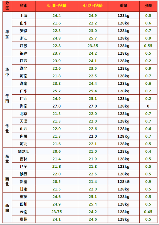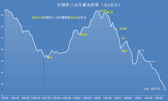 整体看来,4月8日,猪价跳水,行情进一步走跌,截止到目前,外三元猪价探底22.9元,猪价相比此前高点,累计降幅达到了13.87元/公斤,猪价大跌37.7%。这也意味着猪市泡沫“崩塌”,此前,受生猪供给不足,猪价长期维持在35~38元/公斤,养猪头均盈利多达2500~3000元!如今,饲料成本上涨,猪场管理成本增加,人工、水电等开销大涨,养猪成本线今时不同往日!据业内人士预估,目前,自繁自养模式下,养猪成本线在8~9元/斤,外购仔猪育肥成本线达到了12~13元/斤,而目前生猪均价跌至11.45元/斤,由此可见,外购仔猪育肥亏损达到0.55~1.55元/斤,而普通自繁自养盈利也仅有3~4元/斤左右,养猪进入微利时代!