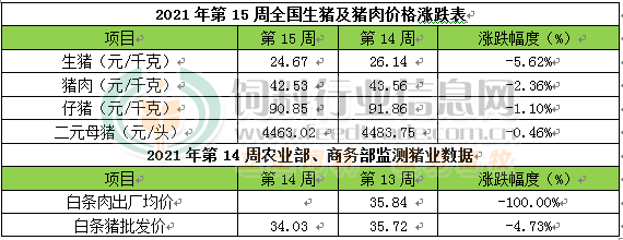 农业部监测数据显示,4月第1周全国规模以上生猪定点屠宰企业白条肉出厂均价暂未公布;4月第1周商务部监测全国白条猪批发均价为34.03元/公斤,环比下跌4.73%。