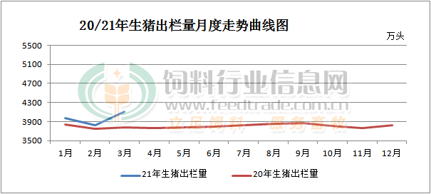 整体上2020年到现在,生猪恢复形势持续向好,2020年能繁母猪存栏基本呈现缓慢增长的态势。而2021年的第一季度除1月份受部分地区非洲猪瘟复发影响,能繁母猪存栏量出现下降外,2-3月份能繁母猪存栏再度增长。随能繁母猪存栏的缓慢恢复,生猪出栏量也随之增加。从上图可以看到,整体上1-3月生猪出栏量高于2020年同期水平,3月生猪出栏量在4110万头左右,环比增长7.59%,生猪供应增加290万头左右,同比增长8.77%,生猪供应同比多了331.42万头。