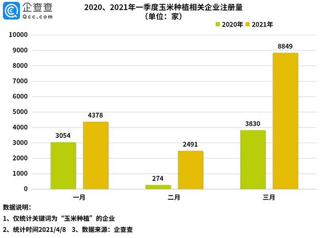 企查查数据显示,今年一季度季度共新增1.6万家玉米种植相关企业,同比增长120%。其中一月注册量达4378家,同比增长43%。二月注册量达2491家,环比下降43%,是2020年2月注册量的9倍。三月注册量为8849家,同比增长131%。