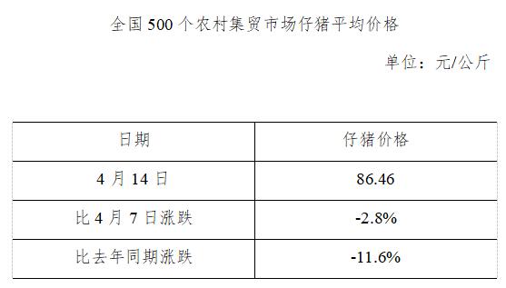 全国500个农村集贸市场仔猪平均价格(2021年4月14日)