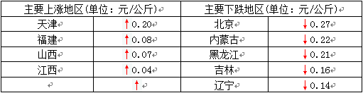 今日全国27省、直辖市范围内,共计4省份猪价上涨,23省份猪价下跌。全国最高价为浙江,较昨日下跌0.05元/公斤于24.79元/公斤;全国最低价为新疆,较昨日下跌0.14元/公斤于20.77元/公斤。