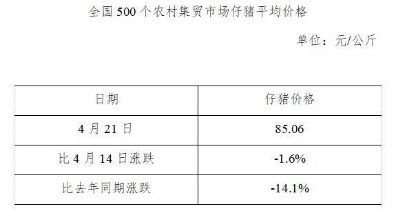 全国500个农村集贸市场仔猪平均价格(2021年4月21日)