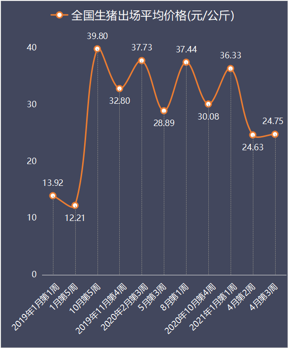 4月第3周的24.75元/公斤,较本轮高点36.33元/公斤跌去31.87%。把时间轴拉长到2019年1月以来,全国生猪出栏价格在10月第5周开始就不断往下调整,而最低点也越来越低。