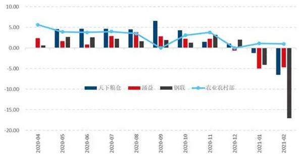 自2020年12月以来,部分地区非瘟疫情开始有所抬头,到2021年1月开始产生较为明显的影响,业内各机构的样本统计及草根调研均反映出国内生猪产能恢复短期受到阻碍,使得1、2月的能繁母猪存栏量较12月出现了环比下降。根据天下粮仓对近1000家的养殖企业的样本进行的统计,截至2月结束,母猪存栏量在425.76万头,环比两月下降,较1月环比下降6.55%,较12月下降7.7%。