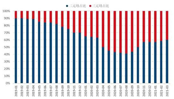 2020年国内进口猪肉439万吨,较2019年的211万吨大幅增加,折算120公斤的生猪大致在5000万头的水平,大致相当于国内年出栏量10%的水平,进口猪肉已经成为国内猪肉供应的重要补充力量。而根据海关统计,2021年1-2月进口冻猪肉延续了大幅度增加的态势,累计进口达到70万吨,折生猪头数在730万头左右,同比增加25%。如果加上猪杂碎,则1-2月进口猪肉及猪碎产品达到90万吨。由于目前国内猪肉价格仍高于国际市场水平,按当前进口成本估算,进口冻肉较国内白条肉出厂价格便宜了40-50%,预计后期国内进口猪肉仍将处于较高的水平。