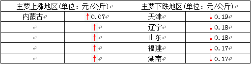 今日部分地区猪价:四川9.3-9.6元/斤,河南9.6-9.9元/斤,江西9.3-9.6元/斤,广东9.4-9.7元/斤,湖南9.6-9.9元/斤,山东10.0-10.3元/斤,湖北9.4-9.7元/斤,河北9.6-9.9元/斤,北京9.7-10.0元/斤,辽宁9.2-9.5元/斤。