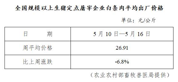 全国规模以上生猪定点屠宰企业白条肉平均出厂价格(5月10日—5月16日)