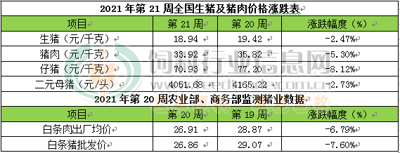 农业部监测数据显示,5月第2周全国规模以上生猪定点屠宰企业白条肉出厂均价为26.91元/公斤,环比下跌6.79%;5月第2周商务部监测全国白条猪批发均价为26.86元/公斤,环比下跌7.60%。
