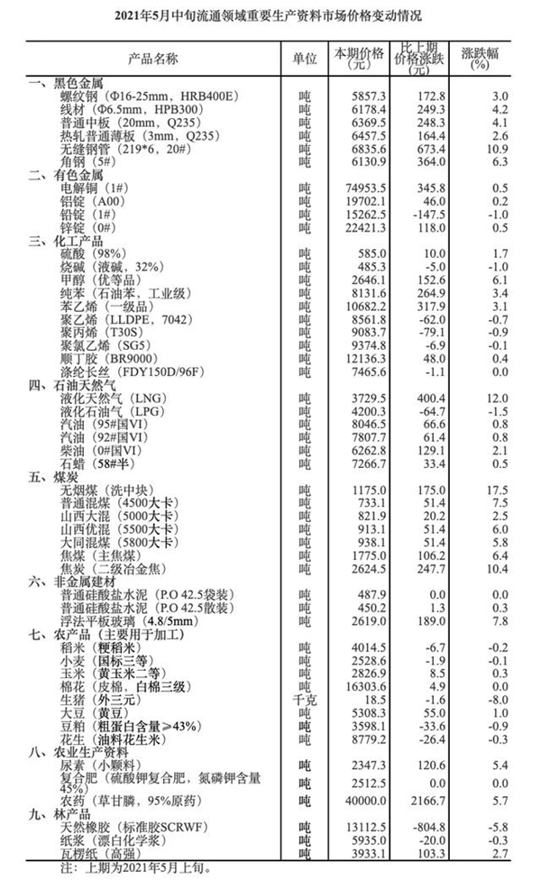 5月24日,国家统计局发布了2021年5月中旬流通领域重要生产资料市场价格变动情况。