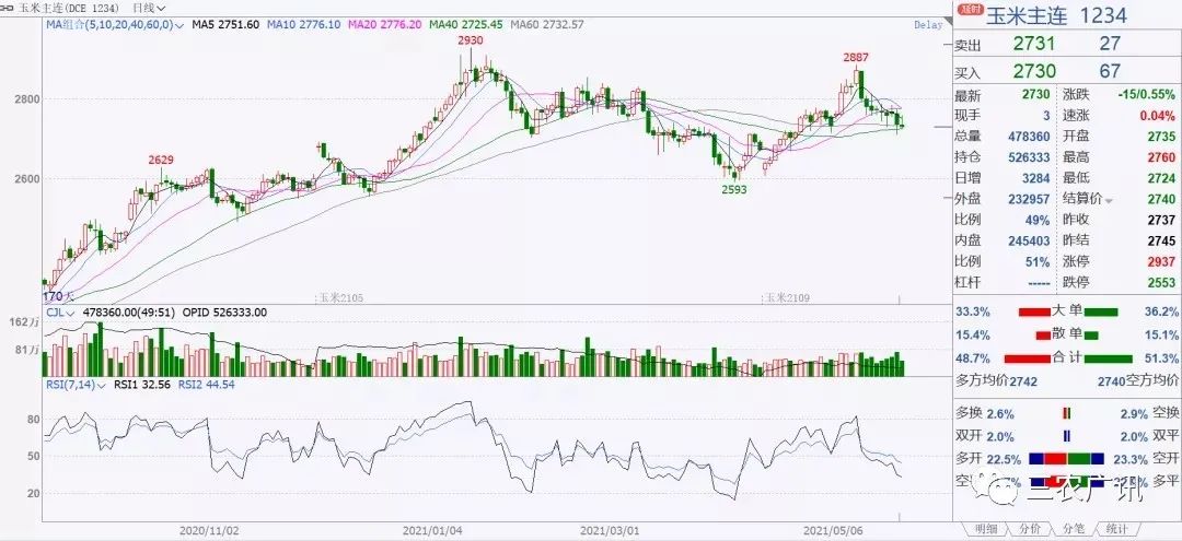 最近玉米价格二次起跳,牛市遇到新“梗阻”。5月中旬末开始,玉米现货市场、期货市场出现冰火两重天的走势,一边是由于山东地区玉米上量急剧下滑,到车量降到100、200台的情况下,连续多日出现上涨,山东玉米价格再度站上1.53元/斤的制高点,然而另一边则是玉米期货市场的“10连跌”,由2887元/吨的高点回落到的2700元附近。