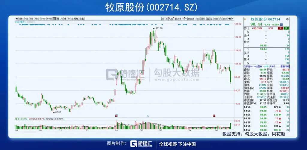 5月24日,“猪中茅台”牧原股份(002714.SZ)逼近跌停,尽管5月25日开盘牧原股份股价有所反弹,但据时代财经统计,其股价已较年内最高点跌超30%,市值蒸发逾1300亿元。