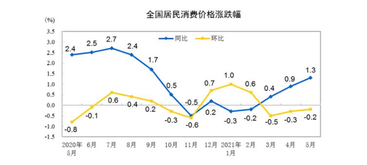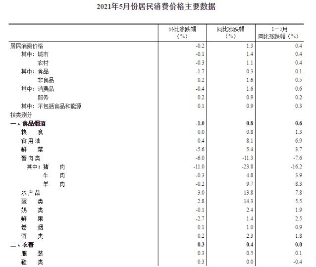 统计局:2021年5月CPI同比上涨1.3%猪肉价格下降23.8%