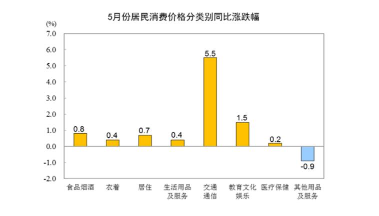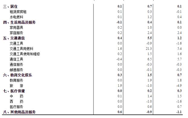 其他七大类价格同比六涨一降。其中,交通通信、教育文化娱乐、居住价格分别上涨5.5%、1.5%和0.7%,衣着、生活用品及服务、医疗保健价格分别上涨0.4%、0.4%和0.2%;其他用品及服务价格下降0.9%。