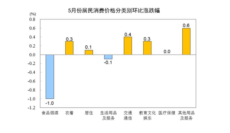5月份,全国居民消费价格环比下降0.2%。其中,城市下降0.1%,农村下降0.3%;食品价格下降1.7%,非食品价格上涨0.2%;消费品价格下降0.4%,服务价格上涨0.2%。