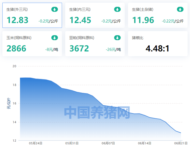 据中国养猪网数据,6月21日,生猪(外三元)均价为12.83元/公斤,较昨日下跌0.2元/公斤。与此同时,生猪(内三元)均价为12.45元/公斤,较昨日-0.2元/公斤;生猪(土杂猪)均价为11.96元/公斤,较昨日-0.22元/公斤。