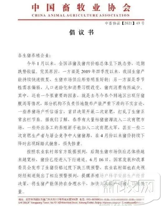 21日下午,中国畜牧业协会发布倡议书,倡议书倡议不要恐慌,更不要以赌博心态安排生产。并建议加快淘汰低产母猪,特别是淘汰留作种用的三元肥猪,提高母猪繁殖效率,提高饲料转化率,增强竞争力。