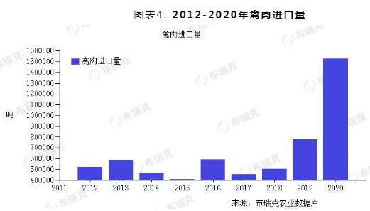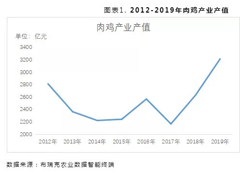 2012-2018年我国鸡蛋产业平均产值在2400亿元左右,2019年我国鸡肉产量为1449.68万吨,禽肉进口量为77.96万吨,禽肉出口量为16.65万吨 ,鸡肉产业占禽肉产业9成左右,2019年我国肉鸡产业产值约3216.8亿元。
