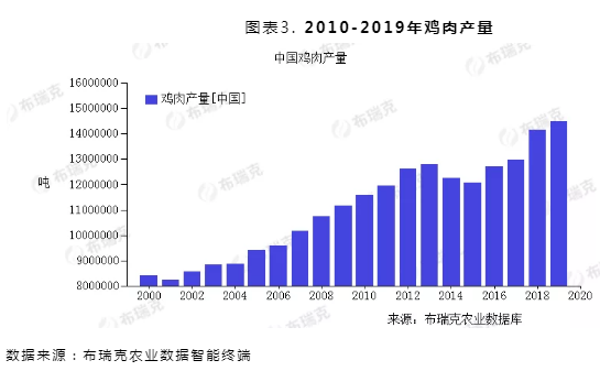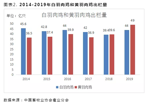 2019年因非洲猪瘟疫情影响,生猪养殖规模大幅下降,肉鸡养殖再度增长。据中国畜牧业协会禽业分会统计,2019年中国出栏肉鸡122亿羽。其中,白羽肉鸡44亿羽,黄羽肉鸡49亿羽,其他肉鸡29亿羽(817杂鸡18亿羽,淘汰蛋鸡11亿羽)。
