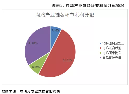 肉鸡产业链条包括饲料原料及加工、繁育养殖、屠宰批发、终端零售环节,整体来看,50.2%的利润在于繁育养殖环节,其次是终端零售环节占33.8%,屠宰批发环节占8.49%,饲料原料及加工环节占生猪产业链利润分配较少为7.44%。