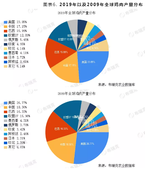 2019年全球鸡肉主产国有美国、中国、巴西、欧盟、俄罗斯等,美国鸡肉产量以19.8百万吨居于首位,而中国以13.8百万吨鸡肉产量超过巴西、欧盟位居第二。