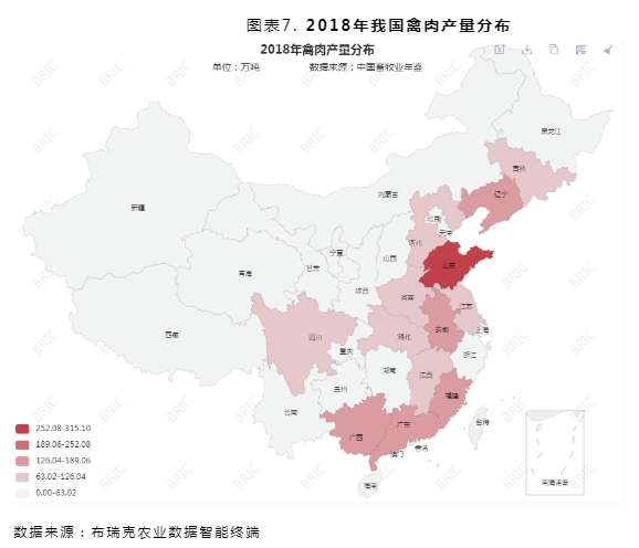 我国禽肉主产区是辽宁、山东、广东、广西、福建、安徽地区。据中国畜牧业协会数据显示,肉鸡地区出栏量首位是山东肉鸡出栏量为22.1亿只;其次是广东,肉鸡出栏量为14.8亿只;再次是福建,肉鸡出栏量为14.3亿只。