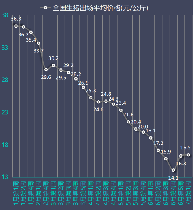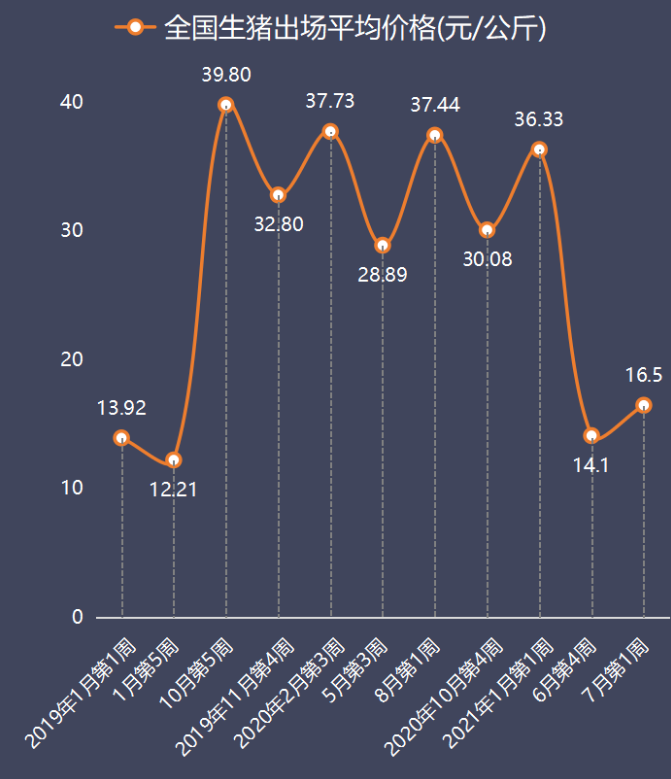 国家发改委网站最新披露的《2021年7月第1周猪料、鸡料及蛋料比价》显示:7月第1周全国生猪出场价格为16.46元/公斤,环比上周小涨1.04%。自2021年1月第1周上涨到本轮高点36.33元/公斤以来,近期猪价具体走势图如下: