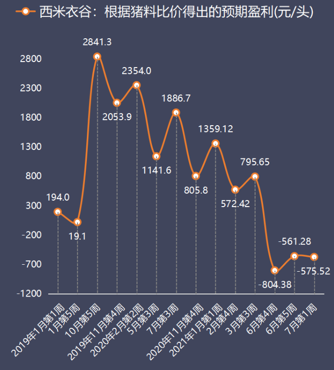 养猪行业从5月第3周开始预亏,到7月第1周已经是连续八周预亏,在6月第5周亏幅有所收窄后,7月第1周亏幅又有所扩大。
