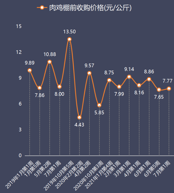 7月第1周全国肉鸡棚前收购价格为7.77元/公斤,环比上周涨1.57%。