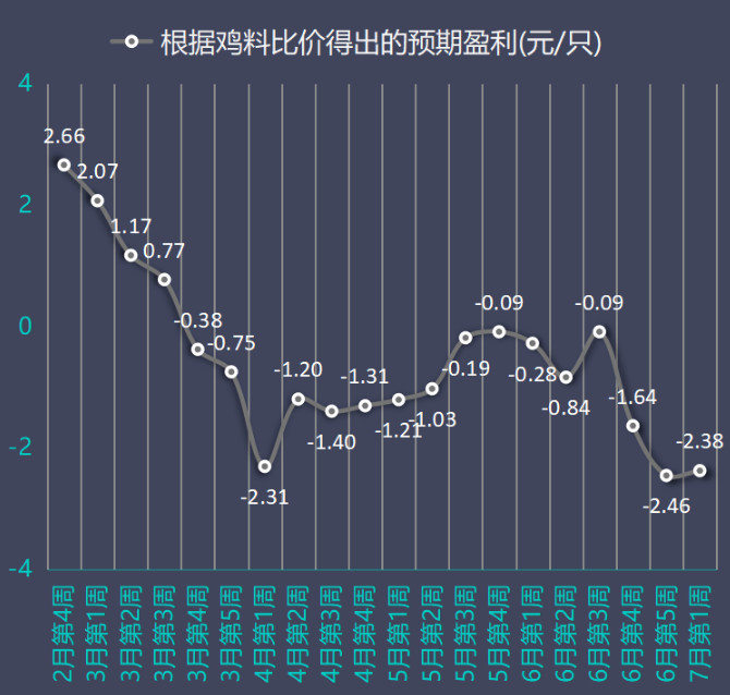 如上图,自2021年3月第4周开始亏钱以来,养鸡已经连亏16周,且6月第5周创下最大亏幅,7月第1周依然狠亏。