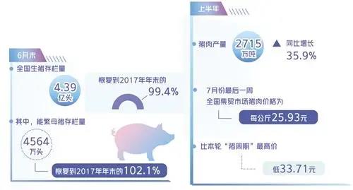 目前,生猪生产已完全恢复,《加快生猪生产恢复发展三年行动方案》确立的目标任务提前完成。据国家统计局统计,6月末全国生猪存栏量4.39亿头,恢复到2017年年末的99.4%。其中,能繁母猪存栏量4564万头,恢复到2017年年末的102.1%。上半年猪肉产量2715万吨,同比增长35.9%。7月份最后一周,全国集贸市场猪肉价格为每公斤25.93元,比本轮“猪周期”最高价低33.71元。