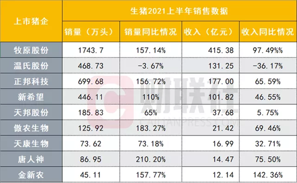 根据半年报,牧原股份实现净利润111.63亿元,同比下降5.06%,温氏股份(300498,SZ)亏损25亿,较同期利润下降160.14%,正邦科技(002157,SZ)亏损8.9亿,较同期利润下降134.41%,新希望 ( 000876,SZ ) 亏损23亿,较同期利润下降170.19%,天邦股份(002124,SZ)亏损6.5亿,较同期利润下降142.38%。