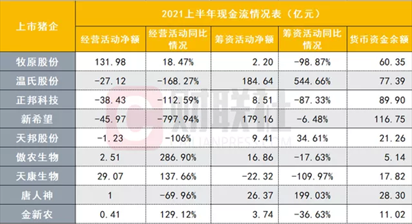有财务专业人士表示,结合猪企业绩,经营活动现金流量净额为负并不意外,出现这种情况代表正常主营经营活动中现金流入无法弥补现金支出,在企业亏损状态时比较常见。出现这种情况也提醒企业增强资金回笼、提高主营业务 "造血 "能力,同时,在经营活动无法提供正向现金流时,企业筹资能力就显得尤为重要。