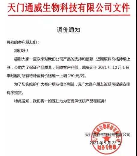 据饲料行业信息网相关的统计数据显示,9月26日为周日,加上不少油厂因限电影响并未报价,但已出价格的相关主流沿海油厂的43%蛋白的豆粕报价为3830-3930元/吨,较周五3800-3910 元/吨上涨20-30元/吨,一些中西部的油厂豆粕报价更是突破了4000元/吨。正是由于豆粕等原料上涨,有饲料企业调整饲料价格,其中天门通威生物科技决定于1月1日对多有特种鱼上调150元。