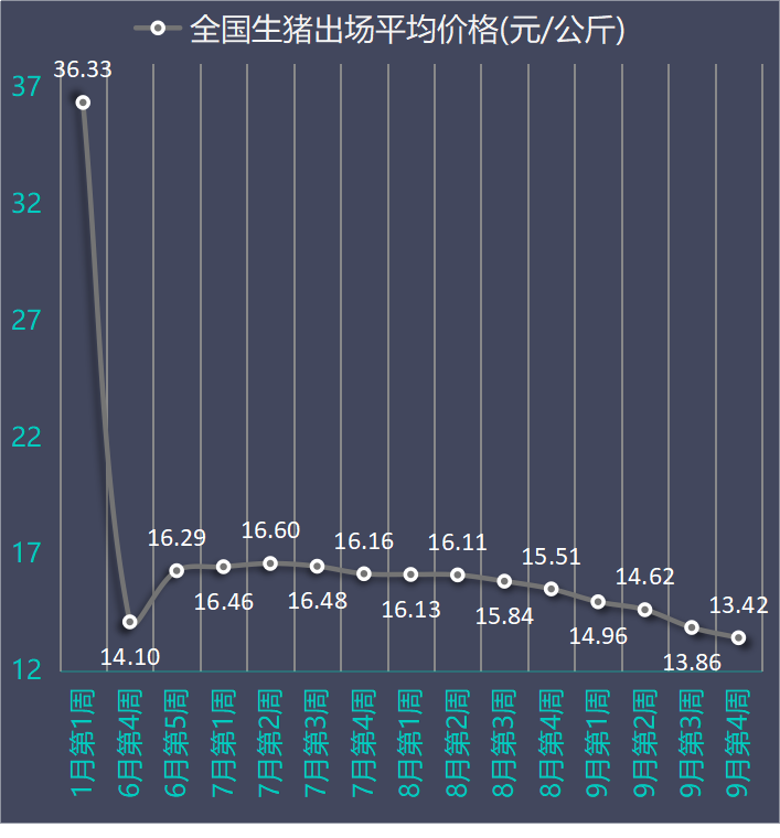 如上图,9月第4周13.42元/公斤的猪价,再创本轮下跌之新低。这一价格,也是自2019年3月第2周以来的最低价,当时的价格为14.74元/公斤。