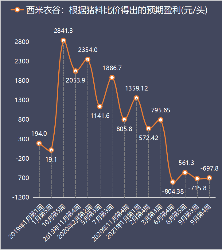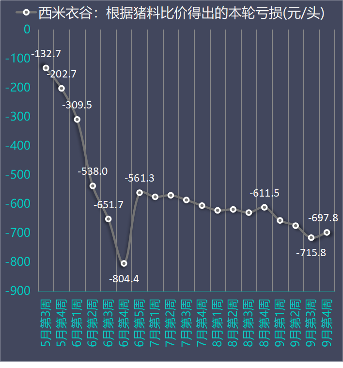 养猪行业从5月第3周开始预亏,到9月第4周已经是连续19周预亏。这19周的预亏情况如下: