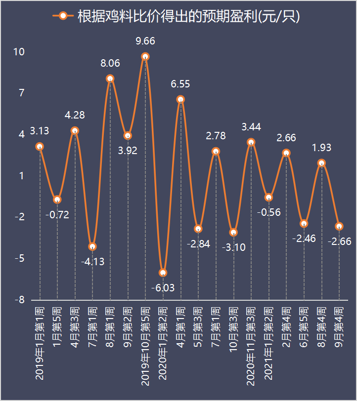 肉鸡养殖在连续五周预计盈利之后,9月第2周转为预亏,9月第4周亏幅已超上一轮最大亏幅。