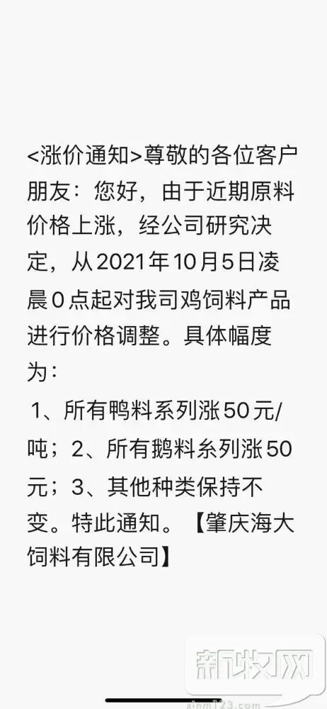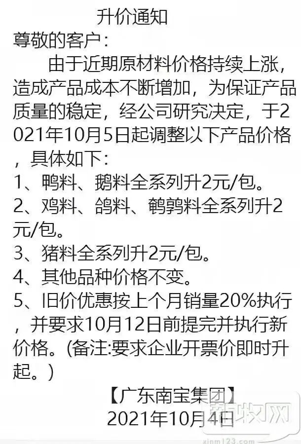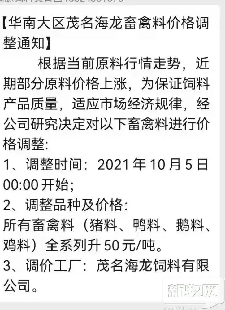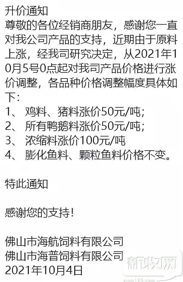 为保证饲料产品质量,近日。肇庆海大、新粮饲料、广东南宝、茂名海龙饲料、佛山海航、佛山海普等多家饲料厂宣布涨价,涵盖猪、鸡、鸭、鹅、鱼多种养殖饲料,涨价幅度为50-100元/吨。