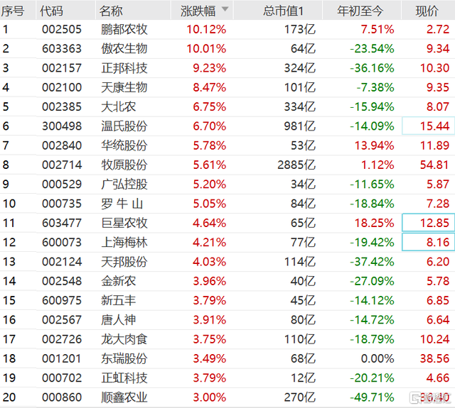 格隆汇10月8日丨节后第一个交易日,A股猪产业链股集体大涨。其中,鹏都农牧和傲农生物涨停,正邦科技逼近涨停,天康生物涨超8%,大北农、温氏股份涨超6%,华统股份、牧原股份、罗牛山涨超5%,天邦股份涨超4%,新五丰、唐人神、龙大肉食、正虹科技和顺鑫农业涨超3%。