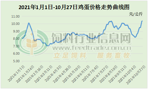 总体上今年鸡蛋价格明显高于2020年。从上图可以看出,8、9月期间价格最高突破10元/公斤。从9月中旬开始鸡蛋价格明显回落,主要原因是由于气温逐渐转凉,蛋鸡逐渐进入产蛋高峰期,鸡蛋供应增加,叠加当时猪价持续走跌,肉价跌破10元/斤,利空蛋价,蛋价出现回调。但鸡蛋价格仅回调了一个月左右的时间就再度明显上涨,截止10月27日鸡蛋均价涨至10.5元/公斤,突破今年新高。